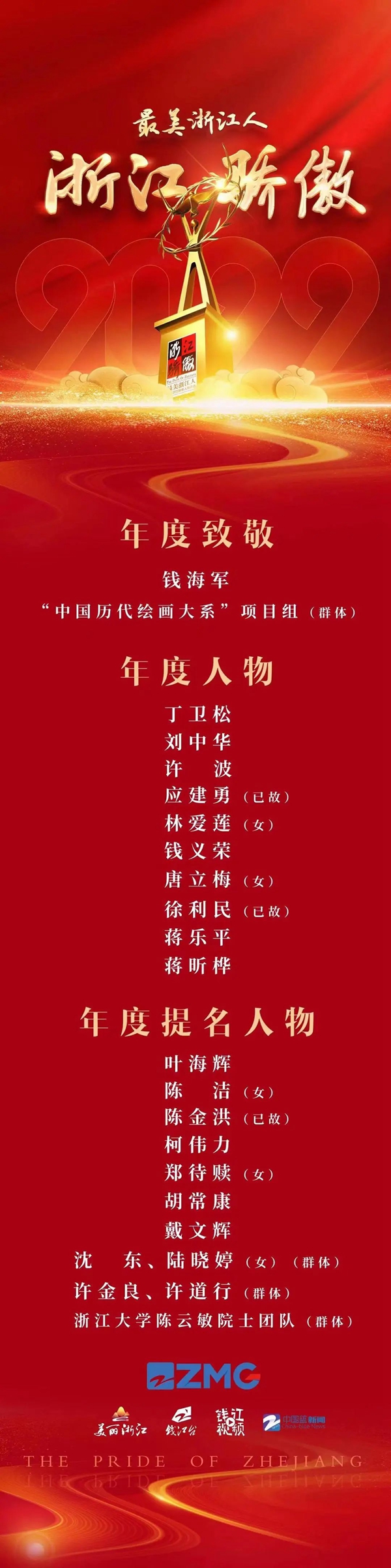 由省委宣传部、浙江广电集团主办,全省30多家媒体联办的2022年度“最美浙江人·浙江骄傲”年度人物5日晚正式揭晓。